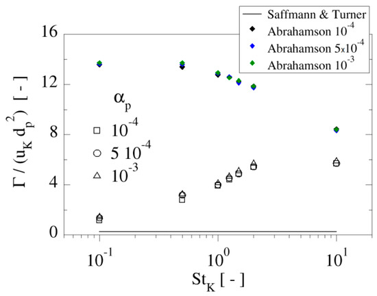 Collision kernel, normalised by the Kolmogorov velocity, and the square of particle diameter, obtained by the present simulations as a function of the particle Stokes number and for the three average particle volume fractions. The Saffman and Turner [44] and Abrahamson [45] kernels for colliding particles are also shown for comparison.