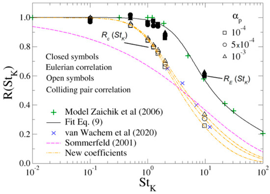 where is the Stokes number based on the fluid Lagrangian integral time scale. Coefficients appearing in Equation (6) were obtained after comparison with LES computations of Reference [34] by trial and error. Such correlation has been employed successfully for predicting the effect of inter-particle collisions in pneumatic conveying and particle separation processes [9,10,11,35], and it is shown in Figure 12. A more rigorous way to determine the particle-pair velocity correlation function between colliding particles, , was developed in Lain et al. [36]. In such study, the model proposed in Zaichik and Alipchenkov [37] (or its refined version, [18]) developed for homogeneous isotropic turbulence was solved to build the Eulerian particle-pair velocity correlation function between colliding particles, . The conclusions obtained in Reference [36] are revised in this section in light of the new DNS results obtained.