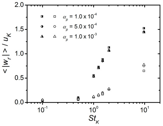 Another interesting fact that can be observed in the correlation functions in Figure 12 is that, for a fixed particle Stokes number, their values increase with increasing solid volume fraction. The counterpart, seen in Figure 13, is that the radial relative velocity between colliding particles decreases with increasing volume fraction. This fact was already shown by the authors of Reference [38], who also observed that the mean angle formed by the velocities of colliding particles was increasing with particle inertia. These authors ascribed such behaviour to a kind of collective motion of particles in clusters. Such phenomenon has also been found in the present work and it was illustrated in Figure 8a. However, in the present study, such trend is not as evident as in that research because they employed higher values of than in this work.