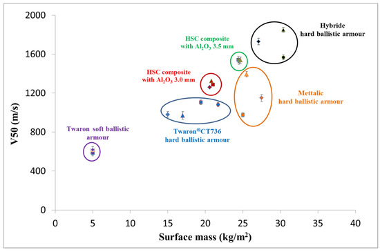- HSC composites containing Al2O3 ceramics with a thickness of (3.0 ± 0.2) mm used in conjunction with soft ballistic insert containing 42 layers of Twaron®CT612;