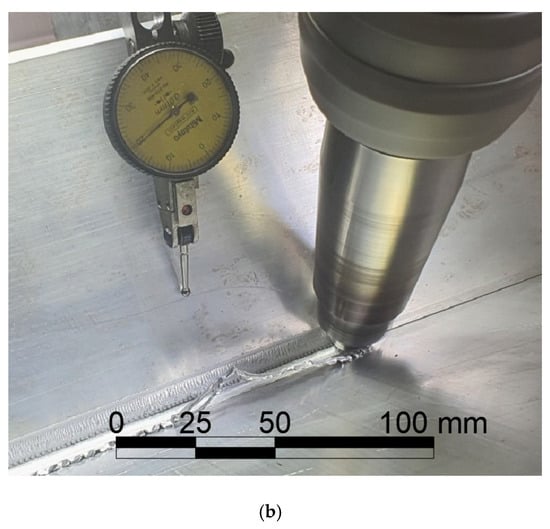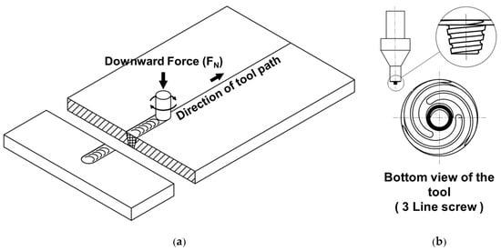 Friction stir welding has generally been limited to butt welding, as shown in Figure 2a. This is because the welding area between the tool and the materials to be joined is the widest, and when the rotating tool presses the base material with a constant force during the welding process, it is easy to obtain a fixing force to prevent the base material from bending on the opposite side of the welding surface. Frictional heat is generated on the tool’s shoulder side, pin lateral side, and the area where the pin bottom side meets the base material, and the frictional heat generated from the shoulder side accounts for 90% of the frictional heat generated by the tool. However, in the case of fillet joint FSW, the frictional heat decreases as the friction area between the tool shoulder and the base material decreases, as shown in Figure 2c. Therefore, several studies related to fillet joints have been performed in the past by conducting FWS on T-joint specimens to solve this problem, as shown in Figure 2b, but it is difficult to find cases applied to actual structures [,,,,]. Even in the automotive industry, the application of FSW is limited to butt welding processes in general, but conventional fusion welding techniques such as metal inert gas (MIG) welding, tungsten inert gas (TIG) welding, and laser welding are used for fillet joint processes. These fusion welding techniques cause excessive welding deformation and residual stress in addition to the phase change of the base material around the weld because the heat input is very high. Welding deformation can cause problems in the manufacturing process and the assembly with other structures, and reduce the mechanical strength due to high residual stress. It can also cause frequent quality issues such as welding defects (pores and cracks) in the welds due to process problems.