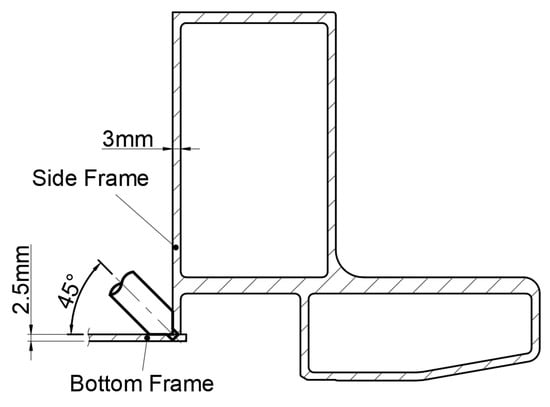 The type of joint applied in this study is a fillet joint where the side frame and the bottom frame meet, as shown in Figure 3. The side frame is made of extruded aluminum material with a hollow cross-sectional structure. As it is structurally impossible to insert the tool from the opposite side of the joint as shown in Figure 2b, FSW is performed on the fillet joint by tilting the tool at a 45° angle as shown in Figure 2c. The hollow cross-sectional structure of the side frame is a structure in which the inside of the base material is not full of solids. In this case, backing plates cannot be installed on the opposite side of the joint to support the downward force of the tool when performing FSW. Therefore, it is much more difficult to perform fillet joint FSW welding on hollow cross-sectional structures compared to specimen units.