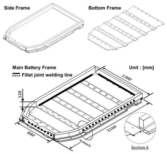 In the existing automobile manufacturing process, metal inert gas (MIG) and tungsten inert gas (TIG) welding are mainly used. These welding methods are fusion welding, and the heat input in the welding area is very high. Therefore, the deformation of the base material is large, and the residual stress in the vicinity of the welded area is high, resulting in the problem of reduced mechanical strength. In this study, friction stir welding (FSW) was applied to the welding process of the structure constituting the battery frame of a newly developing electric vehicle to compensate for this problem. The welded part is the fillet joint of the side frame and the bottom frame, and experiments and numerical analysis were performed on the welding deformation and residual stress of the full frame structure. A specially manufactured angle head was used for friction stir welding of the fillet joint of extruded type aluminum, not the existing solid type. The optimum process was derived through experiments, and the temperature of the welding center was derived through test correlation between the value of measured temperature and the finite element model. The final deformation result was verified by comparing it with the measured value using a dial indicator. It is expected that the proposed thermal elasto-plastic analysis method will reduce the testing period and the cost of the manufacturing process and increase productivity.