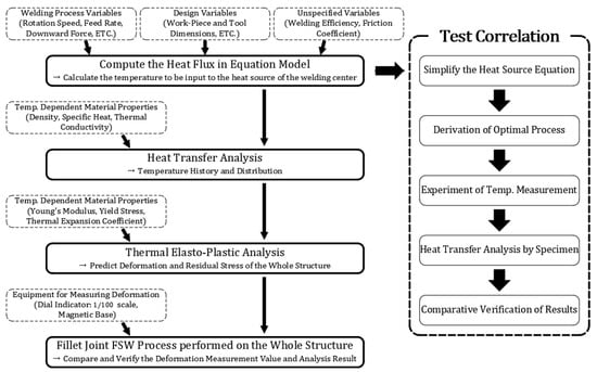 This study was performed according to the flow chart in Figure 6. First, a theoretical model for estimating the heat source was developed to specify the temperature of the welding center. The heat source was calculated by a relational expression of process variables (rotation speed, welding speed, and the tool’s downward force), design variables (workpiece and tool dimensions), and unspecified variables that are difficult to calculate theoretically or experimentally (welding efficiency and friction coefficient).