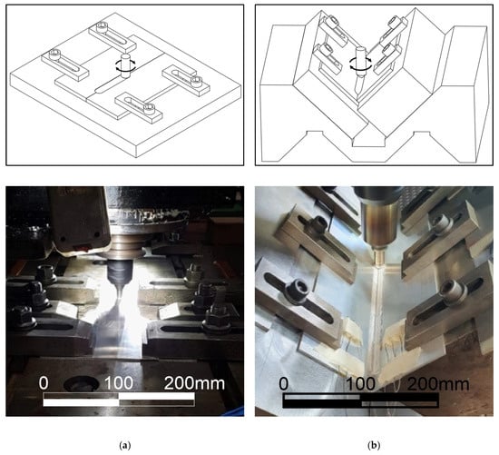 First, FSW was performed on specimen units for process conditions such as rotation speed and welding speed to find the optimal process conditions for friction stir welding. To investigate the tendency of each welding method, this study performing basic butt FSW and fillet joint FSW using jigs and compared the conditions of the two processes, as shown in Figure 8.