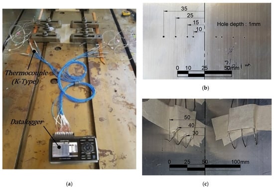 Next, temperature measurement experiments were performed under the optimal process conditions. Temperature measurements were made with a thermocouple and data logger, as shown in Figure 9a. The thermocouple was inserted at a certain distance from the welding center line, as shown in Figure 9b,c for butt FSW and fillet joint FSW to measure the temperatures.