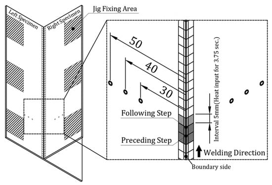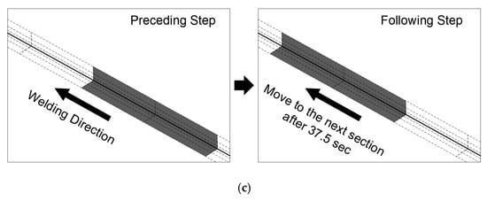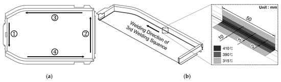 The simulation was performed by transient analysis to investigate the history of temperature according to time. The welding process sequence was in the order of front, rear, right, and left, as shown in Figure 15a, to conduct the pre-process of heat transfer analysis. To enter the temperature of the heat source derived through test correlation into the center of the weld, this study created an area to enter the heat source in the welding direction of the 3D model as shown in Figure 15b. The area to enter the heat source was divided into 50 mm sections from 2, 5, and 10 mm from the welding center line. The temperature entered in this range was determined by averaging the temperatures derived through the specimen unit test correlation as shown in Table 9. The movement of the heat source under optimal process conditions (80 mm/min welding speed) was implemented by configuring time steps to enter temperatures every 37.5 s in the temperature input area divided into 50 mm sections. The heat source application time (welding time) was 1 h, 21 min, and 40 s, and the cooling time to lower the temperature of the structure to room temperature was 1 h, so the total time step was set to 2 h, 21 min, and 40 s. In terms of the convection heat transfer coefficient, which is a factor that affects the cooling of the structure, this study applied 20 for areas in contact with air and 200 W/m2·°C for areas in contact with metal by jigs [,].
