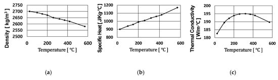 Thermal elasto-plastic analysis requires material properties such as the coefficient of thermal expansion, Young’s modulus, and yield stress. Therefore, as shown in Figure 17, this study used material properties including nonlinear temperature history information []. Figure 18 shows mesh for thermal elasto-plastic analysis, and Table 10 shows the mesh properties.