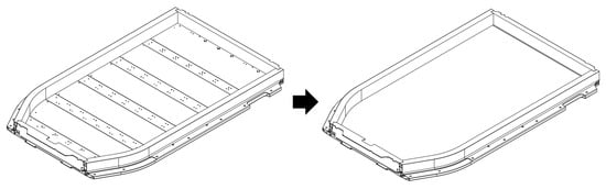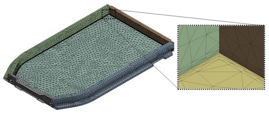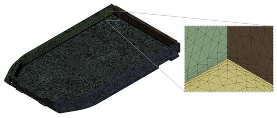 As shown in Figure 12, the 3D design geometry of the full-frame structure was simplified before conducting the simulation. The overall shape was simplified by removing negligible geometric elements such as the chamfer and round of corners, the holes for inserting bolts and positioning pins, and the protrusions on the bottom frame to improve the mesh quality. Figure 14 shows mesh for heat transfer analysis consisting of triangular elements, and Table 8 shows the mesh properties such as the conditions, method, size, quality, and the number of nodes and elements.