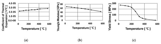 AL6063-T5 material properties required for thermal elasto-plastic analysis: (a) Coefficient of thermal expansion; (b) Young’s modulus; (c) yield stress.