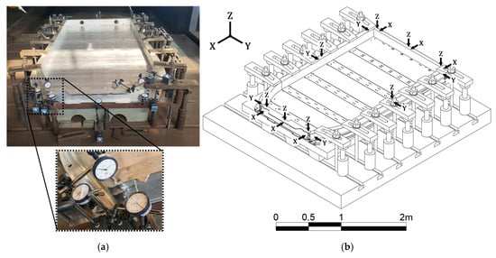 FSW deformation measurement of actual full-frame structural: (a) Position of dial indicator; (b) measurement direction of deformation.
