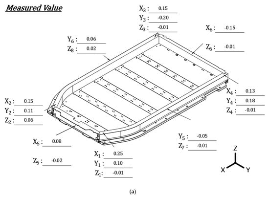 In terms of load, the thermal analysis result data was applied to the time steps and geometry. In terms of boundary conditions, geometric constraints were applied in the X (length), Y (width), and Z (height) directions in 13 areas constrained by jigs as shown in Figure 19. Constraints were only applied in the Z direction for the bottom surface, and the X and Y directions were free of constraints.
