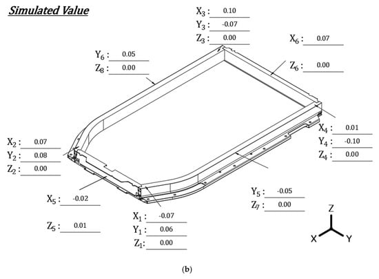 Figure 21a shows the deformation history of the structure during all of the analysis steps. The deformation was purely thermal deformation caused by thermal load, resulting in a range of 1–2 mm during welding, as the downward force of the tool was not considered for analysis. Figure 21b shows the actual deformation in the side frame measured during welding, and the maximum measurement was 1.9 mm. Even though deformation caused by downward force was not considered, the results showed a small margin of errors, and the final deformation after cooling was expected to be within ±0.1 mm. Figure 22 shows the final measured and simulated deformation values after cooling for each direction at each point and Table 11 shows the differences between these values.