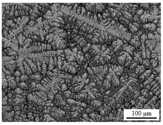 The elemental composition of as-cast high-Mn TWIP steel ingots containing 30 wt.% Mn, 5 wt.% Al, 0.5 wt.% C, 0.01 wt.% S, <0.01 wt.% P, and balance Fe, was determined by X-ray fluorescence (XRF) using a S8 Tiger (Bruker, Middleton, WI, USA) wavelength dispersive spectrometer. Specimens were obtained from ingots of TWIP steel prepared in a high temperature furnace using an alumina crucible and argon as a protective gas environment. The main constituents of the alloy are Fe and Mn, while Al and C are the main alloying elements. Figure 1 shows a typical microstructure of as-cast specimens with dendrites and interdendritic spaces of a solidification microstructure.