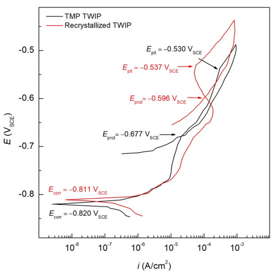 Electrochemical parameters obtained from the CPP tests of TMP and recrystallized TWIP steels in deaerated 1.0 wt.% NaCl solution (see Figure 4).
