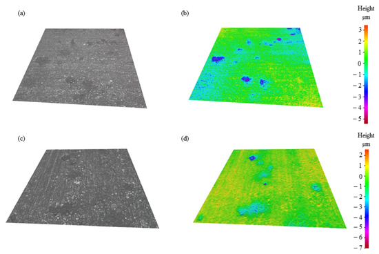 Infinite focus microscopy (IFM) images after CPP in deaerated 1.0 wt.% NaCl: (a) TMP TWIP sample, (b) TMP TWIP topography, (c) recrystallized TWIP, and (d) recrystallized TWIP topography.