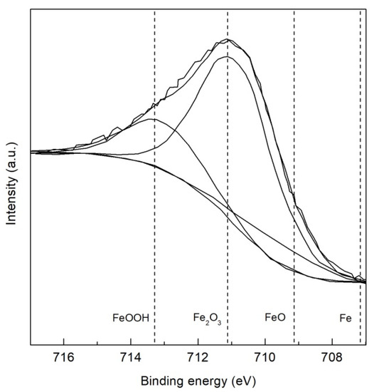 XPS surface analysis was conducted using a PHI 5000 VersaProbe II (Physical Electronics Inc., Chanhassen, MN, USA) spectrophotometer with an Al Kα source (hv = 1486.6 eV), a working residual pressure below 10−9 torr, a high-voltage excitation of 15 kV, a power of 25 W and a take-off angle of 45° with respect to the sample surface. The high resolution XPS used a CLAM2 hemispherical electron analyzer with a non-monochromatic Mg Kα X-ray source operated at 300 W, with a pass energy of 23.5 eV and at energy step size of 0.2 eV/step. The Fe 2p3/2, Al 2p, Mn 2p, O 1s, and C 1s areas were analyzed. The calibration was done on Ag standard substrate, using independent measurements for the Ag 3d5/2 peak (368.3 eV). A Gaussian–Lorentzian mixed function was used to fit the data, after a Shirley background subtraction [28]. The binding energy reference used was adventitious C, with 285.0 eV for C 1s peak.