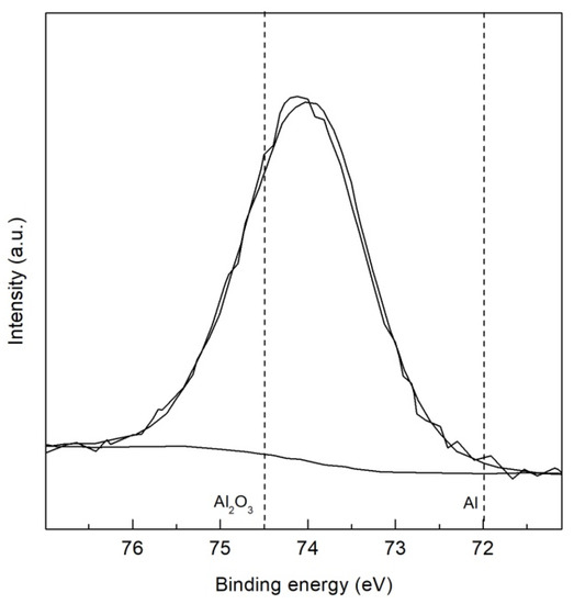 The high resolution XPS spectra of the TMP TWIP steel is presented in Figure 6 and Figure 7 for Fe 2p3/2 and Al 2p, respectively. Four peaks were assigned to iron, metallic Fe at 707.2 eV, Fe2+ oxide (FeO) at 709.2 eV, Fe3+ oxide (Fe2O3) at 711.2 eV, and Fe3+ oxyhydroxide (α–, β– or γ–FeOOH) at 713.3 eV as observed in Figure 6 [34,38,39]. Figure 7 shows high resolution XPS spectrum of TMP TWIP steel specimen for Al 2p containing two peaks assigned to metallic Al at 72.0 eV and Al3+ oxide (Al2O3) at 74.5 eV. This Al2O3 layer present in the surface is related to the passive behavior observed in the CPP tests performed. High resolution XPS spectra for the recrystallized TWIP steel specimen were not included because no additional peaks were revealed, also showing four peaks for Fe 2p3/2, and two peaks for Al 2p.