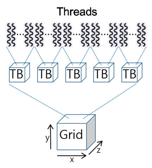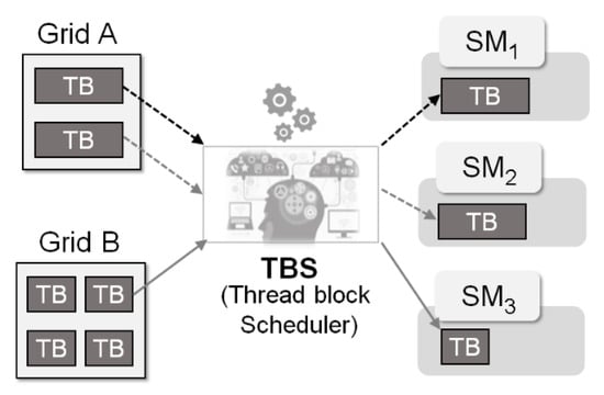 With the rapid advances in many-core hardware technologies, GPGPU (General-Purpose GPU) has expanded its area from graphical processing to various parallel processing jobs. Specifically, as the era of the 4th Industrial Revolution emerges, GPGPU has become an essential computing device in various domains such as deep learning, block-chain, and genome analysis [1,2]. GPGPU has tens of thousands of computing units, which can maximize their performances by executing threads in each unit on parallel [3]. In general, total threads to be executed are grouped into a certain number of threads called thread blocks, which are the allocation unit for hardware resources. For example, in CUDA [4,5], which is a representative GPGPU programming platform, each thread is included in a thread block, which is identified by the three-dimensional indices, and the thread blocks can be represented as a three-dimensional grid to define a GPGPU task as shown in Figure 1. Meanwhile, since GPGPU hardware is composed of tens of stream multiprocessors (SM), a thread block scheduler that allocates thread blocks to SM is necessary. In the current system architecture, the thread block scheduler is implemented as hardware in the GPGPU device.