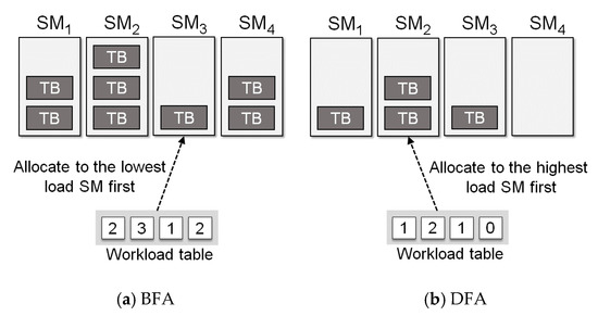 The current GPGPU makes use of the Round-Robin scheduling policy that sequentially allocates th read blocks to SM. Although this is simple to implement, it may cause the bias of loads among SMs [17]. In this article, we use two scheduling policies called BFA (Breadth First Allocation) and DFA (Depth First Allocation) as shown in Figure 4. BFA monitors the resource utilization in each SM and allocates thread blocks preferentially to the SM that has the lowest load. By doing so, the resource utilization among SMs can be balanced, which eventually leads to the reduction of the execution time. Unlike BFA, DFA allocates thread blocks to SMs with the highest resource utilization. This is a scheduling policy that can increase the utilization of GPGPU if the load becomes high. Figure 5 shows an example situation that can be accommodated by DFA, which is not possible if we apply BFA. We implement our GPGPU simulator based on the proposed thread block scheduler model. We have opened our simulator for other researchers to replay it [12].