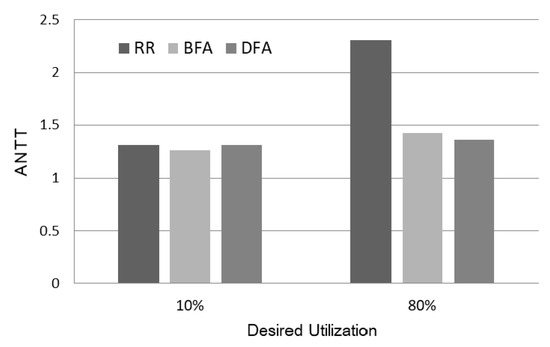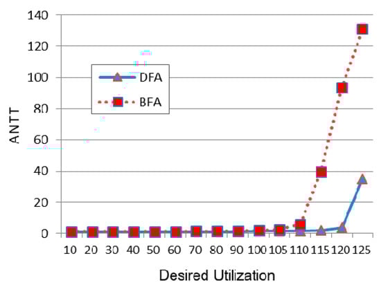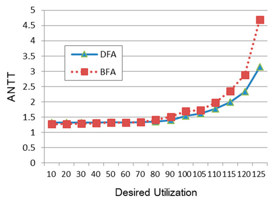 Figure 8 shows the performance of BFA and DFA relative to Round-Robin as the desired utilization is largely varied. Although we increase the desired utilization to 125%, which exceeds the total computing resources, it can be seen that the actual utilizations of BFA and DFA are only 76.1% and 76.4%, respectively, which are within acceptable ranges. Thus, it is meaningful to see the performance trend when the desired utilization is as large as 125%. However, as shown in Figure 8, ANTT increases steeply as the desired utilization becomes over 100%. Also, when comparing BFA and DFA, it can be seen that DFA performs even better than BFA when the load becomes extremely high.