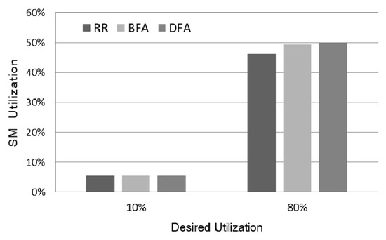 Figure 7 shows the actual utilization of SM as the scheduling policies and the desired utilization are varied. As shown in the figure, the actual utilization of the three policies is significantly lower than the desired utilization. This is due to the internal fragmentation of the workloads. When the workload is not heavy, the utilizations of the three policies exhibit similar results. However, as the workload becomes heavy, the actual utilization of Round-Robin is about 8% less than that of the other policies. Compared to the result in utilization, the gap in ANTT was very large; hence, it can be seen that increasing the utilization through efficient thread block scheduling is important to enhance the actual performance.