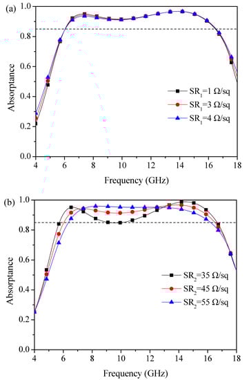 In order to further explore this mechanism, the effects of each parameter of the transparent absorber on the absorption property were analyzed. As shown in Figure 4, the absorption response of the proposed absorber under different sheet resistance values of each layer was studied. Note that when the sheet resistance of one layer changed, the sheet resistance of the other two layers remained unchanged. It can be observed from Figure 4a that as the resistance SR1 increased, the first absorption peak intensity slightly decreased, while the second absorption peak intensity stayed pretty much the same. Therefore, changes in SR1 had little impact on absorption performance. The smaller SR1 is, the lower the optical transparency of the absorber is, and the better the shielding effectiveness is. Thus, considering the optical transparency and shielding effect, SR1 = 3 Ω/sq was selected. It can be seen from Figure 4b that with the increase in resistance SR2, the first absorption peak intensity first decreased and then increased, while the second absorption peak intensity decreased. At the same time, the first and second absorption peaks shifted toward each other. Therefore, the absorption bandwidth of the absorber decreased with the increase in SR2. Thus, it is clear that there is an optimal sheet resistance value (SR2 = 45 Ω/sq) for the widest absorption bandwidth (greater than 85%). In this case, the two absorption peaks overlap and together form a continuous broadband absorption of above 85%, ranging from 6.0 to 16.5 GHz. As shown in Figure 4c, the first and second absorption peak intensities slightly increased with the increase in resistance SR3. At the same time, the change in SR3 had little influence on the absorption bandwidth. Considering that ITO is difficult to prepare when its sheet resistance is very high, we chose SR3 = 200 Ω/sq. In conclusion, the absorption performance of the absorber was not sensitive to SR1 and SR3, but sensitive to SR2. Therefore, in preparation, SR2 needs to be strictly controlled, while SR1 and SR3 can be appropriately relaxed.