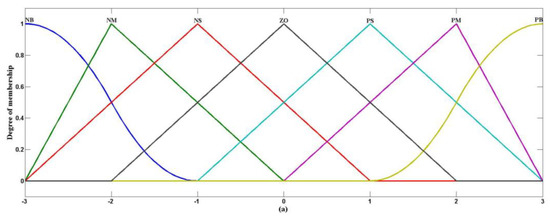 From Figure 12, the PID controller is calibrated by the fuzzy controller. Deviation and the deviation rate are used as the input, and the corrections of three parameters (, and ) are used as the output. The basic domain of , , and is {−3, −2, −1, 0, 1, 2, 3}, and the basic domain of and is {−0.3, −0.2, −0.1, 0, 0.1, 0.2, 0.3}. The fuzzy subset is divided into seven levels (including NB–negative big, NM–negative medium, NS–negative small, Z–Zero, PS–positive small, PM–positive middle, and PB–positive big). The membership function of each variable selects the z-shaped membership function on the left, the s-shaped membership function on the right, and the combined function form of the trigonometric function in the middle. The membership curves of , , , , and are shown in Figure 13. Control rules of parameters , , and are shown in Table 2. According to the control rules, the fuzzy relation () of PID parameters can be expressed as follows: