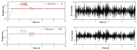 Three sets of comparative experiments are described in this section, for which the trajectory references were set as 0.3 m, m, and m, respectively. The first command aimed to illustrate the dynamic performance of the proposed system under a unit step response, the second command was set to evaluate the performance of a normal-level motion trajectory (constant forging process), and the third one tried to verify its performance for a fast motion trajectory (fast forging process).