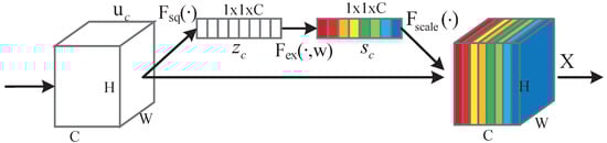 However, in order to obtain better network performance, a squeeze and excitation attention mechanism is used in the network []. Its structure is shown in Figure 2. One of the novelties of the algorithm in this paper lies in the use of the attention mechanism in the residual structure to further improve the feature extraction ability of the network, especially for the extraction of electrical features that are not frequently used. This attention mechanism is different from the previous structure, as it improves performance from feature channels. The first 3D matrix in Figure 2 is composed of a feature graph C with a size of .