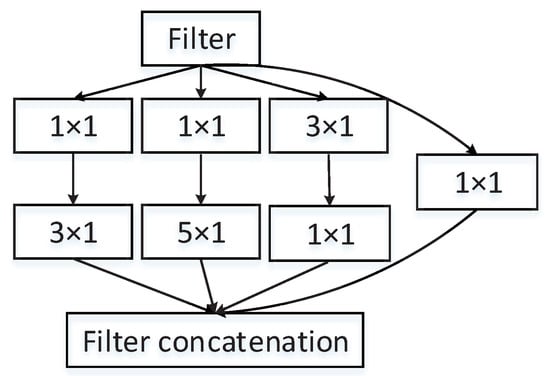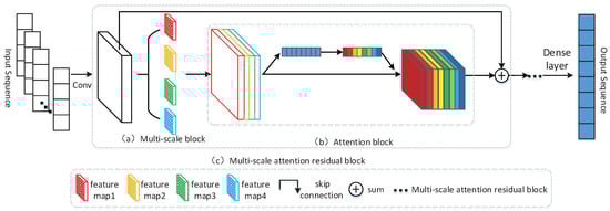 (a) The multi-scale module is composed of convolution kernels with sizes of , , and and the pooling layer []. By combining (b) the attention block and the residual structure, (c) the multi-scale attention residual block is formed. The structure of (a) is shown in Figure 4.