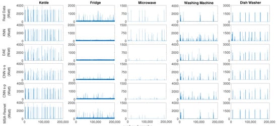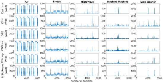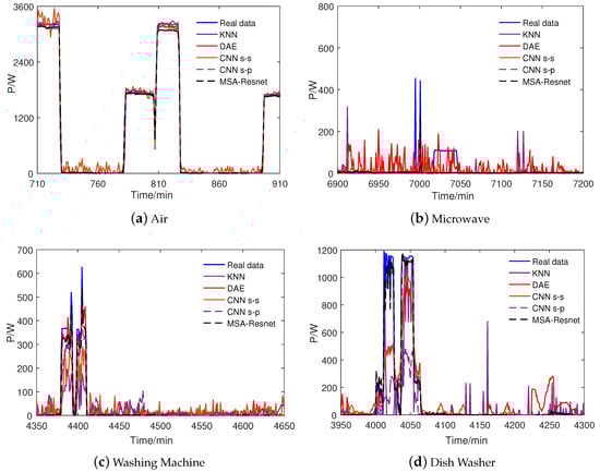 Figure 10 shows load disaggregation comparisons of these five methods over a period of time. It can be seen from the figure that, compared with other algorithms, the MSA-Resnet could better disaggregate equipments, whereas the KNN and the DAE have the worst decomposition abilities. For the low-frequency washing machine and dishwasher, the MSA-Resnet could still well fit the power curve, because of its network structure. It uses multi-scale convolutions to obtain rich load characteristics, and it improves the performance of the network through the attention mechanism and the residual structure.
