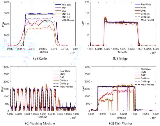 Table 4 shows Household 5’s load disaggregation evaluation index in the UK-DALE dataset. Table 4 shows that the MSA-Resnet does better in and compared with other methods. For the , the MSA-Resnet performs better with respect to the kettle, the fridge, the washing machine, and the dishwasher. The MSA-Resnet has smaller values in the kettle, the fridge, and the washing machine.