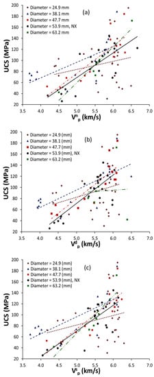 The relationships between the UCS and Vnp, Vdp, and Vsp for various sample diameters are displayed in Figure 1a–c. The correlation coefficient values have a range of 0.04–0.95 (Table 1). The maximum R-value was 0.95, indicating a strong correlation between the UCS and Vnp for a rock sample diameter of 63.2 mm. In contrast, no correlation was observed for Vdp at the same diameter. This result was unexpected and may be due to either invisible natural features of the tested samples or human error during the experiments. In addition, the International Society for Rock Mechanics (ISRM) [] standard states that the specimen diameter for the UCS test should not be less than the NX core size (approximately 54 mm). Therefore, the 53.9-mm sample diameter could be considered to provide the best correlation between the P-wave velocities and UCS.