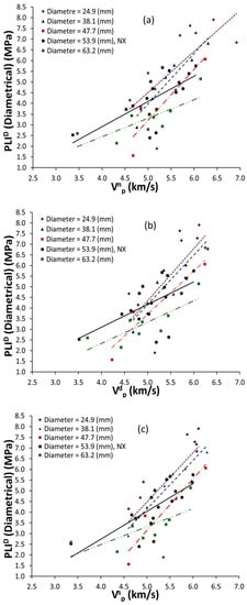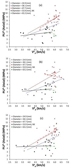 The values of PLIA are plotted as a function of Vnp, Vdp, and Vsp for various sample diameters in Figure 3a–c. The correlations between PLIA and the P-wave velocities exhibit strong variations, ranging from negative to positive (weak to strong) with R-values of −0.29 to 0.92 (Table 1). The maximum and minimum correlation coefficient (R) values were acquired for Vnp and Vsp at sample diameters of 47.7 and 63.2 mm, respectively.