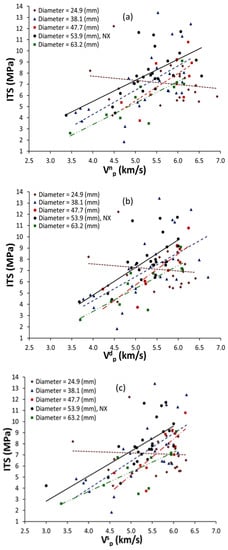 For different sample diameters, the relationships between the ITS and Vnp, Vdp, and Vsp are presented in Figure 4a–c. Except for the 24.9-mm diameter samples, the R-values indicated moderate to strong correlations, with a range of 0.62–0.83 (Table 1). The minimum and maximum R-values were observed for Vsp and the Vnp at sample diameters of 24.9 and 63.2 mm, respectively.