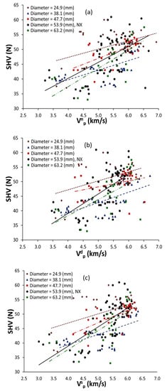 Variation in Schmidt hammer value (SHV). SHV plotted as a function (a) Vnp, (b) Vdp, and (c) Vsp for different sample diameters.