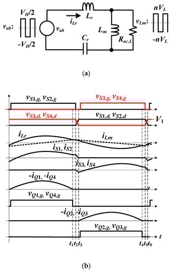 The LLC resonant circuit is controlled to achieve ZVS operation and the bidirectional power operation. The resonant circuit is based on the fundamental frequency analysis to achieve load voltage regulation. According to the switching status of power devices S1~S4 and Q1~Q4, the voltage values VH/2 and −VH/2 are observed on vab, and the other voltage values nVL and −nVL are generated on the magnetizing inductor voltage vLm. Lr, Cr, Lm and Rac,L operate as a filter to suppress the high order harmonics. The root mean square (rms) voltages at the fundamental frequency for input and output sides are and . Based on the power balance between the primary-side and the secondary-side of transformer, the primary-side load resistance is expressed as . The transfer function GH_L(s) between the output and input sides in Figure 2a is obtained as: