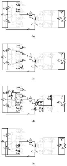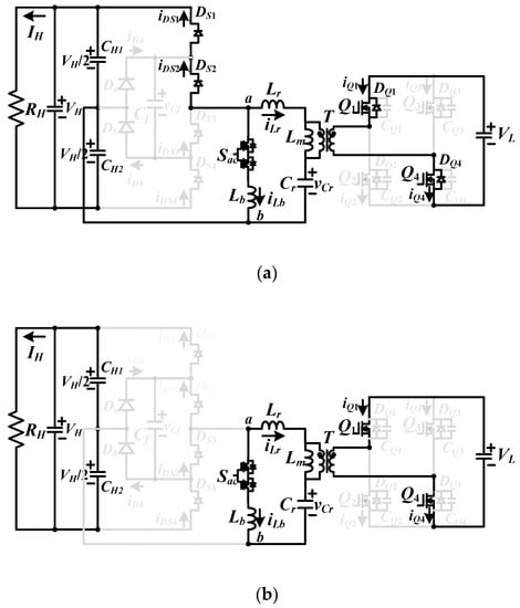 Figure 1a provides the converter schematic of the studied bidirectional converter. There is a three-level diode-clamp circuit topology on the high-voltage side with the benefit of using low voltage rating switches. Clamped diodes Da and Db and capacitor Cf are used to balance input voltages VCH1 = VCH2 and reduce the voltage stress on S1~S4. Full bridge circuit topology is used on the low-voltage side to achieve full-wave rectification. Sac and Lb are series-connection and connect to points a and b in order to achieve LLC circuit operation under backward power flow operation (Sac is ON). For forward power operation from VH (high-side voltage) to VL (low-side voltage), Sac is OFF and Lb is disconnected on the primary-side. Figure 1b gives the circuit structure under forward power operation. S1~S4 are main power devices to control output voltage VL. Lr, Lm and Cr are LLC resonant circuit and Q1~Q4 are activated as synchronous switches. For reverse power operation from the VL terminal to the VH terminal, Sac is ON and Figure 1c provides the circuit diagram of reverse power operation. Switches Q1~Q4 are major power switches and Lr, Lb and Cr are resonant circuit. DS1~DS4 are operated as a full-wave diode rectifier. Therefore, LLC resonant characteristics for both power flow are achieved and the turn-on switching loss of major power switches is removed.