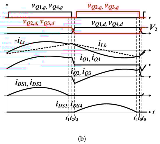 Step 5 (t4≤t < t5):iDS3 = iDS4 = 0 at t4. In this step, Q2 and Q3 are still in the on state so that vLm = −nVL. Lb, Cr and Lr are series resonant.