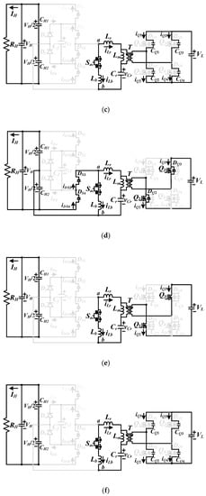 The corresponding equivalent circuits related to six operating steps for forward power operation (a) step 1 circuit (b) step 2 circuit (c) step 3 circuit (d) step 4 circuit (e) step 5 circuit (f) step 6 circuit.