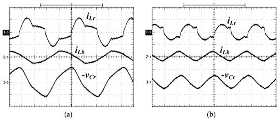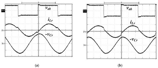Measured results of vab, iLr and vCr at full load (a) VH = 750 V (b) VH = 800 V (vab: 500V/div; iLr: 10 A/div; vCr: 200 V/div; time: 2 µs).