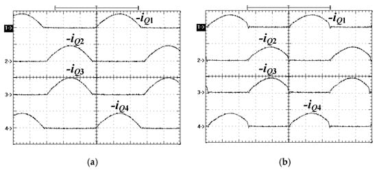 Measured switch currents of Q1–Q4 under full load (a) VH = 750 V (b) VH = 800 V (−iQ1~−iQ4: 50 A/div; time: 2 µs).