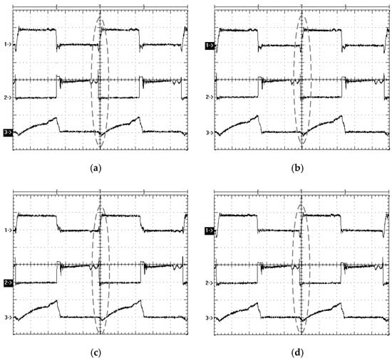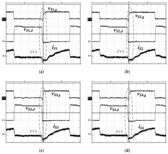 Measured PWM waveforms of S1–S4 at 20% load (a) S1 waveforms (b) S2 waveform (c) S3 waveform (d) S4 waveform (vS1,g–vS4,g: 10 V/div; vS1,d–vS4,d: 200 V/div; iS1~iS4: 2 A/div; time: 1 µs).