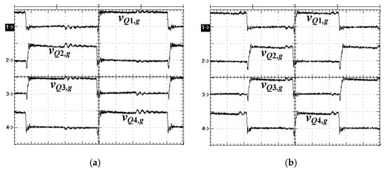 Measured PWM signals of S1–S4 at full load (a) VH = 750 V (b) VH = 800 V (vS1,g~vS4,g: 10 V/div; time: 2 µs).