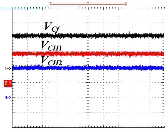 Measured results of VCf, VCH1, and VCH2 under reverse power operation and full load (vCf, VCH1, VCH2, VDa, VDb: 200 V/div; time: 4 µs).
