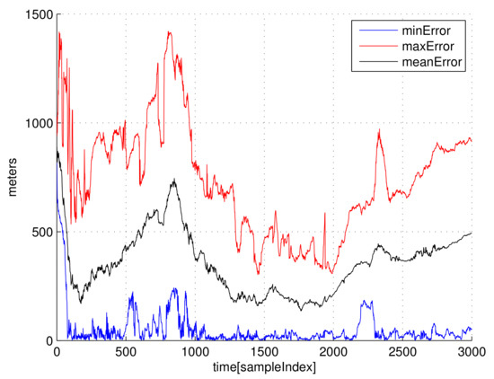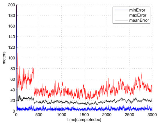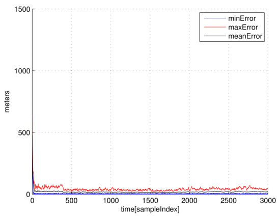 We use MATLAB (MathWorks, Natick, MA, USA) simulations to demonstrate the performance of the proposed localization approach. The scenario runs for 3000 s. The sampling duration is second.