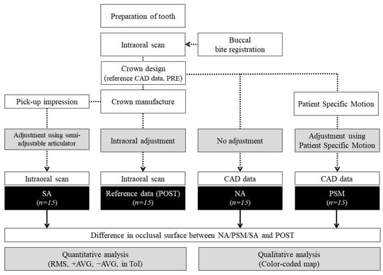 The overall study workflow is presented in Figure 1. All participants had indications of a single posterior crown restoration supported by the tooth or implant. All clinical procedures were performed by a professional dentist (Y.-C.L.) with a prosthodontics specialty.