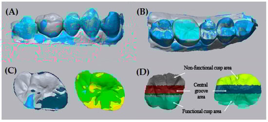Data processing of the experimental groups. (A) The field of interest for the superimposition was limited to two premolars and one molar, except for the treated tooth. (B) Selection of the occlusal surface. The area not belonging to the occlusal surface was removed. (C) 3D comparison using surface analyzing software. For the entire occlusal surface and outside of the tolerance area, the representative values of the occlusal error were calculated. A color-coded map was generated for comparison. (D) To analyze the amount of occlusal error according to the functional properties of the occlusal surface, the occlusal surface was split into three areas. The representative values of occlusal error from each subdivided area were calculated.