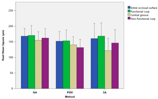 Table 1 shows the RMS ± standard deviation (SD) (μm), +AVG deviation ± SD (μm), −AVG deviation ± SD (μm), and in TOL (%) ± SD of the NA, PSM, and SA groups according to the occlusal surface, functional cusp area, central groove area, and non-functional cusp area, respectively. On the occlusal surface, the RMS values of the NA, PSM, and SA groups were 168.2 ± 43.3 μm, 152.1 ± 54.2 μm, and 160.6 ± 84.6 μm, respectively. The RMS value of the PSM group was lower than that of the other groups, but there was no significant difference in the one-way ANOVA (p = 0.797). The +AVG deviation values of the NA, PSM, and SA groups were 124.5 ± 45.3 μm, 112.3 ± 46.3 μm, and 135.8 ± 52.7 μm, respectively. The −AVG deviation values of the NA, PSM, and SA groups were −87.7 ± 73.1 μm, −93.1 ± 61.5 μm, and −91.5 ± 83.8 μm, respectively. The in TOL (%) values of the NA, PSM, and SA groups were 90.5 ± 6.7%, 92.9 ± 5.9%, and 91.5 ± 8.3%, respectively. The one-way ANOVA showed no statistically significant differences in the RMS value, +AVG deviation, −AVG deviation, or in TOL between the three groups (p = 0.443, 0.980, and 0.658, respectively). An analogous tendency was indicated in the split areas according to functional properties (Figure 5).